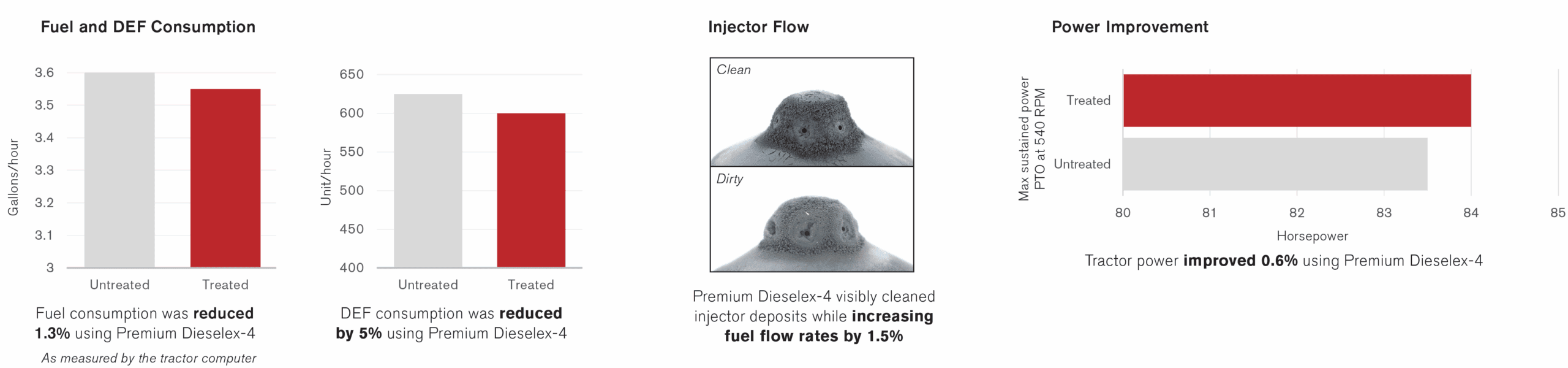 As seen in the results above, CountryMark’s Premium Dieselex-4 improved fuel economy by 1.3% and reduced DEF consumption by 5%. The test also demonstrated the fuel visibly cleaned injector deposits while increasing fuel flow rates by 1.5% and improving tractor power by 0.6%.