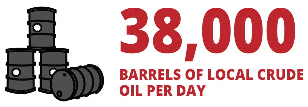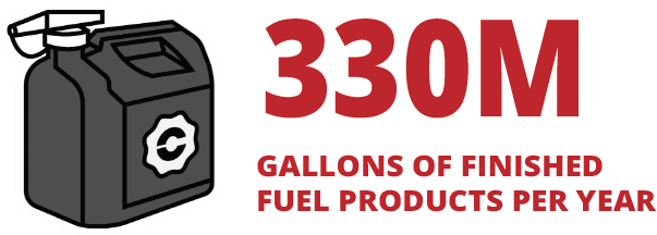 Fast-forward several decades. That same refinery, maintained to state-of-the art standards, now processes 38,000 barrels of local crude oil per day and operates 24 hours a day, 365 days a year. That totals 330 million gallons of finished fuel products per year.